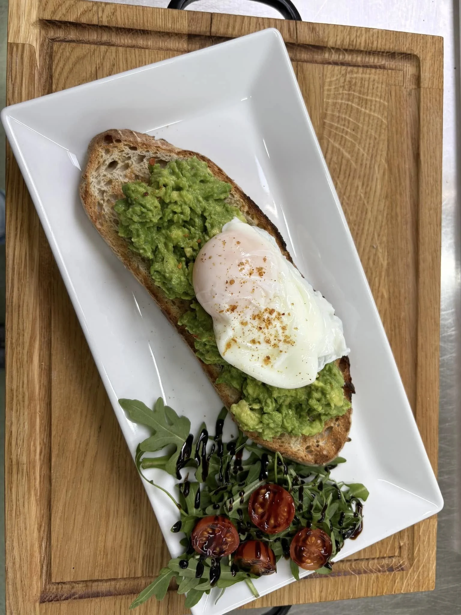 Avocado on toast – thick‑cut toast with smashed avocado, soft poached eggs and salad leaves.